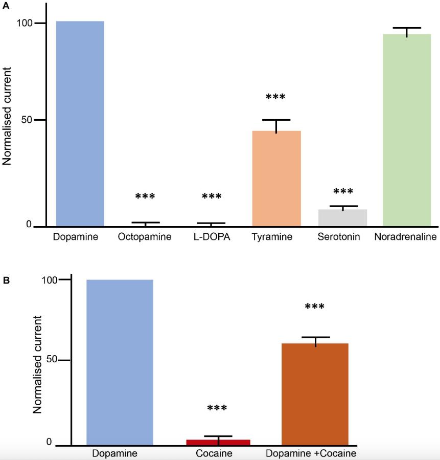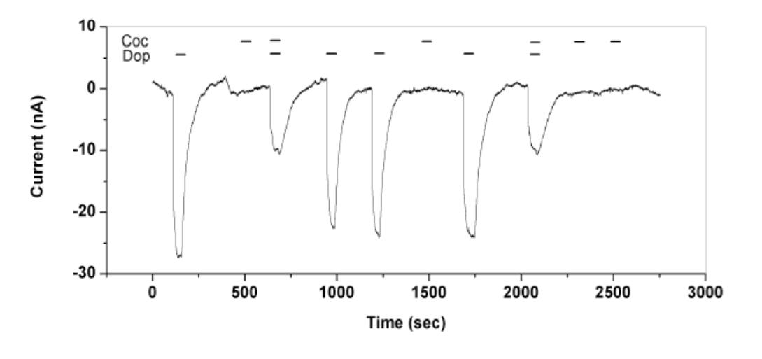 Figure S3B. Inhibition of dopamine transport by AmDAT by the presence of cocaine. The figure presents an example of the inability of cocaine to produce a current in AmDAT expressing oocytes, supported by a significantly smaller normalised current (Mean 3.4 S.E.M. 1.7 p<0.001). Currents induced with a dopamine/cocaine mix were significantly smaller than currents induced by dopamine alone (Mean 61.6 S.E.M. 4.9 p < 0.001) (Figure 3), indicating the inhibition of AmDAT-mediated dopamine transport by cocaine. Currents could still be induced with dopamine after superfusion with cocaine or a dopamine/cocaine mix, showing that cocaine binds to AmDAT in a reversible manner. |
