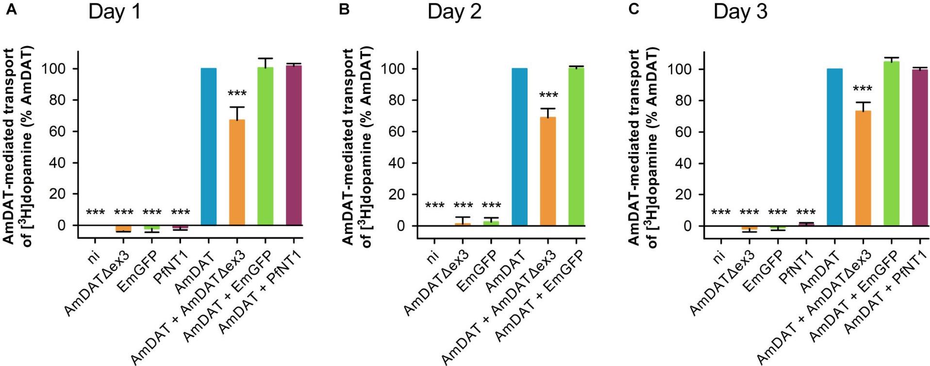 FIGURE 4. AmDATÎex3 downregulates the AmDAT-mediated uptake of dopamine in Xenopus oocytes. Measurements of [3H]dopamine transport were performed on (A) day 1, (B) day 2, and (C) day 3 post-cRNA-injection. Non-injected oocytes (ni) were included as a negative control, EmGFP and PfNT1 were included as co-injection controls, and oocytes expressing AmDAT served as the positive control. Dopamine uptake was expressed as a percentage of that measured in the AmDAT-expressing oocytes. The component of [3H]dopamine transport attributable to AmDAT was calculated by subtracting the background level of accumulation (i.e., dopamine uptake in non-injected oocytes) from that measured for each of the other oocyte types (the total levels of [3H]dopamine uptake are presented in Supplementary Figure S4). In all panels, the data are the mean + SEM of 3â10 independent experiments (performed using oocytes from different frogs), within which measurements were made from 10 oocytes per treatment. âââ denotes a significant difference (p < 0.001) from the positive control (one-way ANOVA). |