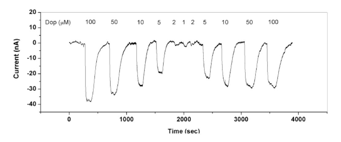 Figure S3A. Response of AmDAT to different concentrations of dopamine Oocytes were injected with AmDAT cRNA and incubated for 3 days. Subsequently, oocytes were held at a membrane potential of -50mV and superfused with ND96 (pH 7.4) alone or ND96 (pH 7.4) containing dopamine at final concentrations indicated above each peak in µM. Plot represents the responses of a single oocyte. Dop: dopamine |