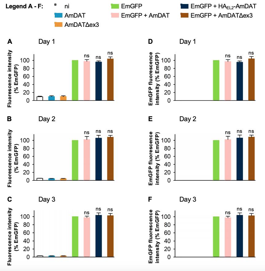 Supplementary Figure 7. Co-expression of EmGFP with AmDAT or AmDATÎex3 in Xenopus oocytes. Lysates of oocytes co-expressing EmGFP with AmDAT, HAEL2-AmDAT, or AmDATÎex3 were prepared on days 1â3 post-cRNA-injection. The negative controls included non-injected oocytes as well as oocytes expressing AmDAT or AmDATÎex3, and oocytes expressing EmGFP served as the positive control. (AâC) Fluorescence intensity was measured using excitation and emission wavelengths of 487 nm and 509 nm, respectively, and expressed as a percentage of that measured in the EmGFP lysates. (DâF) The component of fluorescence attributable to EmGFP was calculated by subtracting the background level of fluorescence (i.e. the autofluorescence detected in lysates of non-injected oocytes) from that measured for each of the oocyte types. In all panels, the data are the mean + SEM of 3â7 independent experiments (performed using oocytes from different frogs), within which measurements were made from 10 oocytes per treatment. ns, no significant difference (p > 0.05) from the positive control (one-way ANOVAs). |