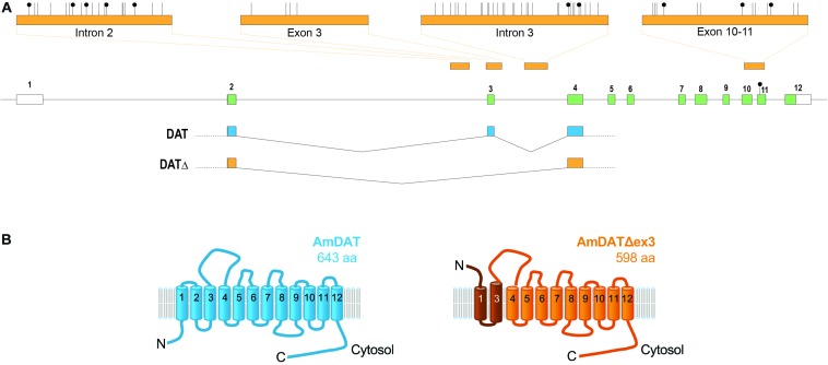 FIGURE 1. The honey bee dopamine transporter (AmDAT). (A) amdat gene model showing the exon and intron junctions of the full-length transcript and its spliced variant, the positions of methylated CpGs (black lollipops), and the regions of four amplicons (top) used for methylation analysis (see the main text and Supplementary Material for more details). The only methylated CpG uncovered by whole-genome methylomics is in exon 11. Protein coding exons are shown in green. (B) The predicted topologies of AmDAT (643 residues; shown in blue) and its splice variant AmDATΔex3 (598 residues; shown in orange). AmDATΔex3 lacks transmembrane domain 2 (TMD2) as well as the following cytosolic loop, resulting in an elongated TMD3. The affected region is shaded dark orange. The orientation of the N-terminus and TMD1 are predicted by TMpred and SPOCTOPUS to be inverted relative to the full-length protein. |