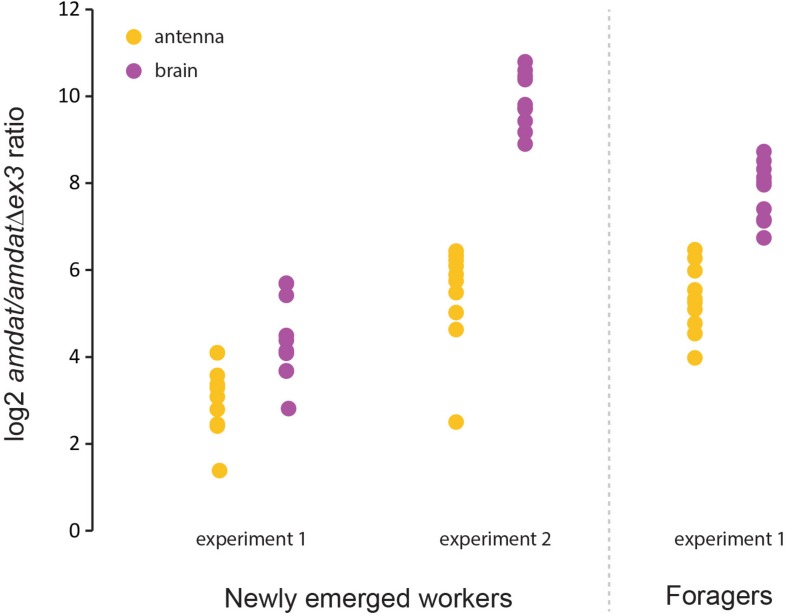 Figure 6. Interindividual variability in the expression of the amdat and amdatΔex3 transcripts. RNAs extracted from single brains were used for qPCR evaluation. Ten individuals were analyzed in each experiment. Refer to the Supplementary Material for further details. |