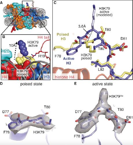 Methylation of histone H3 K79 by Dot1L is a hallmark of actively transcribed genes that depends on monoubiquitination of H2B K120 (H2B-Ub) and is an example of histone modification cross-talk that is conserved from yeast to humans. We report here cryo-EM structures of Dot1L bound to ubiquitinated nucleosome that show how H2B-Ub stimulates Dot1L activity and reveal a role for the histone H4 tail in positioning Dot1L. We find that contacts mediated by Dot1L and the H4 tail induce a conformational change in the globular core of histone H3 that reorients K79 from an inaccessible position, thus enabling this side chain to insert into the active site in a position primed for catalysis. Our study provides a comprehensive mechanism of cross-talk between histone ubiquitination and methylation and reveals structural plasticity in histones that makes it possible for histone-modifying enzymes to access residues within the nucleosome core.