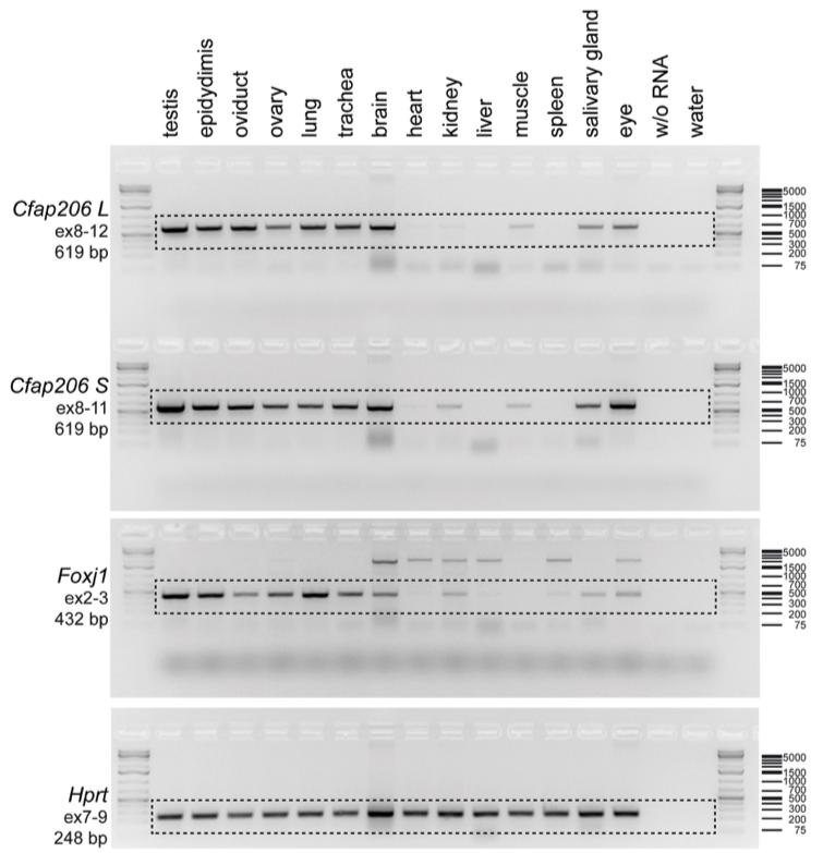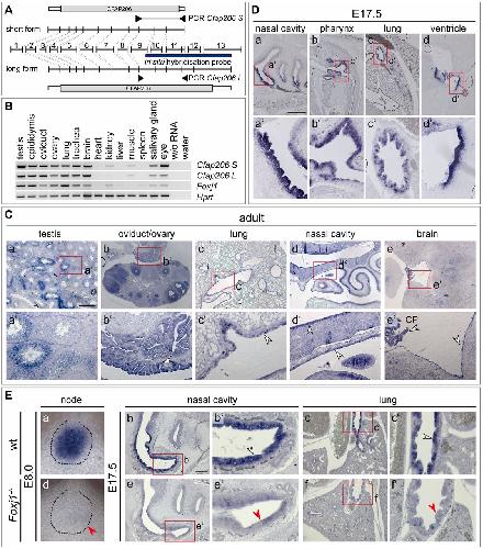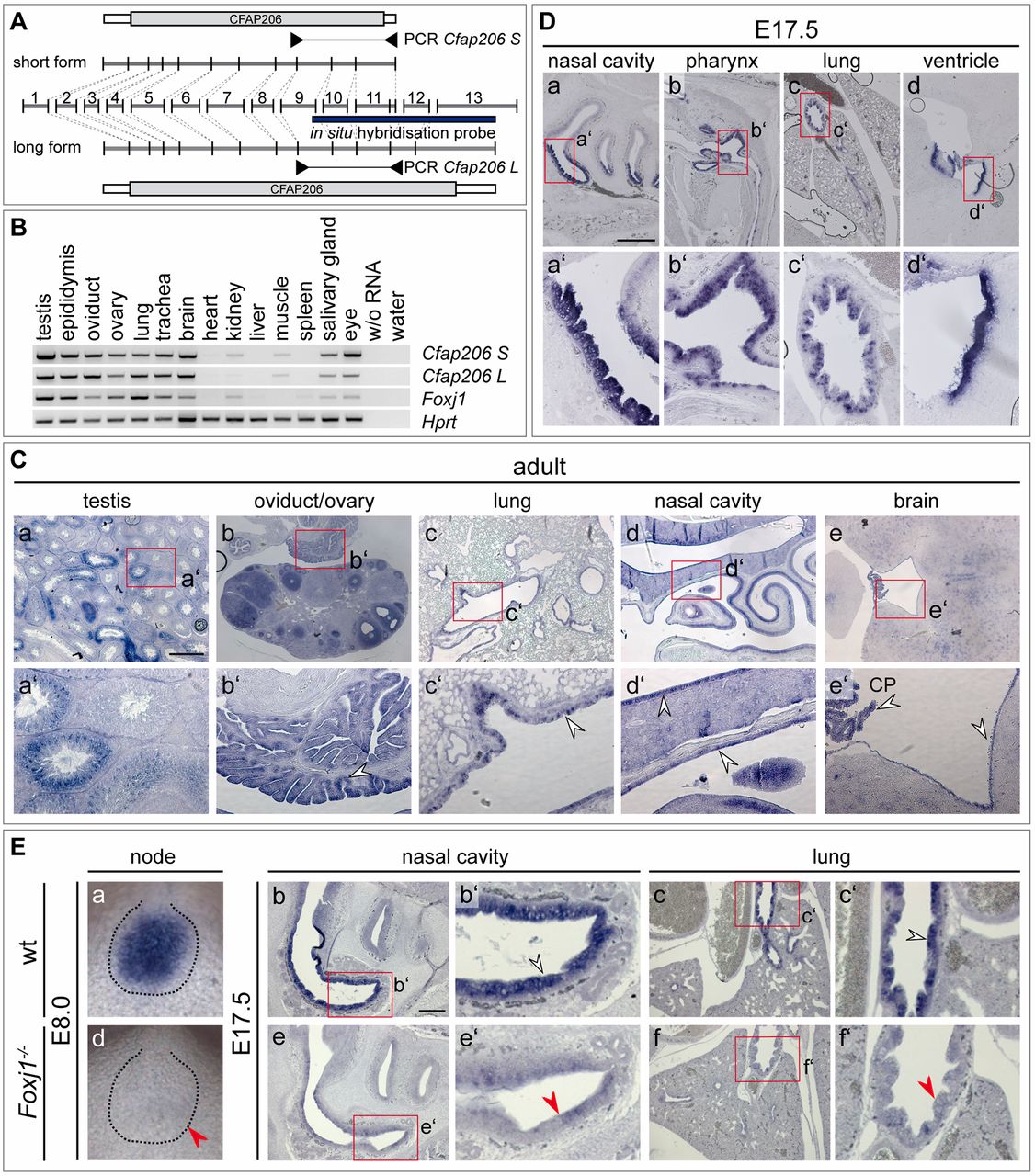 Fig. 1. The structure of the mouse Cfap206 and Cfap206 expression. (A) Schematic depiction of the Cfap206 genomic structure, transcripts and resulting proteins. The Cfap206 gene consists of 13 exons (middle row) that give rise to two transcripts: a short form (Cfap206 S; upper row) and a long form (Cfap206 L; lower row), generated by the differential use of a splice donor site in exon 11. Grey boxes indicate ORFs, white boxes indicate the 5â²- and 3â²-UTR. PCR Cfap206 S and PCR Cfap206 L indicate the position of primers and PCR products used to distinguish between both transcripts. Blue box marks the region used to generate the in situ hybridisation probe, which detected both transcripts. (B) Correlation of Cfap206 S, Cfap206 L and Foxj1 expression in adult tissues assessed by RT-PCR. Hprt was used as quality control. The full-size agarose gel is shown in Fig. S7. (C) Expression of Cfap206 in adult tissues detected by section in situ hybridisation. Boxed areas in a-e indicate the regions shown at higher magnification in aâ²-eâ². Arrowheads indicate regions of expression. CP, choroid plexus. (D) Expression of Cfap206 in tissues developing or carrying motile cilia at E17.5 detected by section in situ hybridisation. Boxed areas in a-d indicate the regions shown at higher magnification in aâ²-dâ². (E) Dependence of Cfap206 expression on FOXJ1. Whole-mount in situ hybridisation (a,d) and section in situ hybridisation (b,c,e,f) on wild-type (a-c) and Foxj1 mutant (d-f) E8.0 embryos (a,d), and E17.5 nasal cavities (b,e) and lungs (c,f). Red boxes in b,c,e,f indicate regions enlarged in bâ²,câ²,eâ²,fâ². Cfap206 expression was reduced or nearly absent in the mouse left-right organiser (LRO), the respiratory epithelium and bronchi of Foxj1 mutants (red arrowheads in d,eâ²,fâ²). Scale bars: 500â