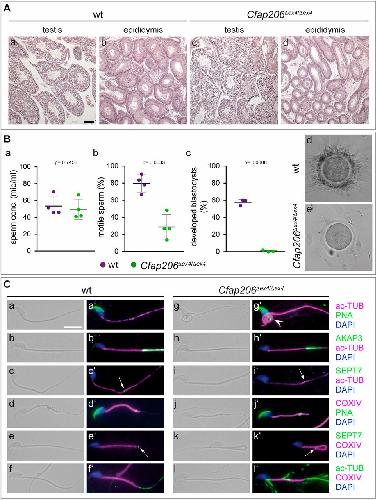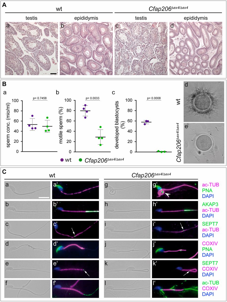 Fig. 7. Non-functional spermatozoa of Cfap206Îex4/Îex4 mutant males. (A) Hematoxylin and Eosin-stained sections of wild-type (a,b) and Cfap206Îex4/Îex4 mutant (c,d) testes (a,c) and epididymides (b,d). (B) CASA analysis and results of IVF showing normal sperm concentration in Cfap206Îex4/Îex4 mutants (a), reduced Cfap206Îex4/Îex4 sperm motility (b), inability of Cfap206Îex4/Îex4 sperm to support early development after IVF (c) and reduced attachment to the zona pellucida in vitro (e). (d) Wild-type egg with wild-type sperm cells. (e) Wild-type egg with Cfap206Îex4/Îex4 sperm. Raw data from CASA analysis (a,b) and IVF (c) are shown in Table S8 and Table S9, respectively. (C) Bright-field (a-l) and fluorescence (aâ²-lâ²) images of wild-type (a,aâ²-f,fâ²) and Cfap206Îex4/Îex4 (g,gâ²-l,lâ²) sperm cells isolated from the cauda epididymis. The following dyes and antibodies were used to visualise organelles and subcellular compartments: DAPI (nuclei; aâ²-lâ²; blue); anti-ac-TUB (axonemes; aâ²-câ²,gâ²-iâ²; magenta); PNA-lectin (acrosomes; aâ²,gâ²,hâ²,jâ²; green); anti-AKAP3 (fibrous sheath; bâ²,hâ²; green); anti-SEPT7 (annuli; câ²,eâ²,iâ²,kâ²; green); and anti-COXIV (mitochondria; dâ²-fâ²,jâ²-lâ²; magenta). Arrowhead in gâ² highlights a coiled flagellum with PNA-stained material; arrows in câ²,eâ²,iâ²,kâ² indicate annuli. Data are mean±s.d. in B with individual data points shown. Scale bars: 100â