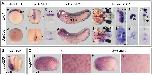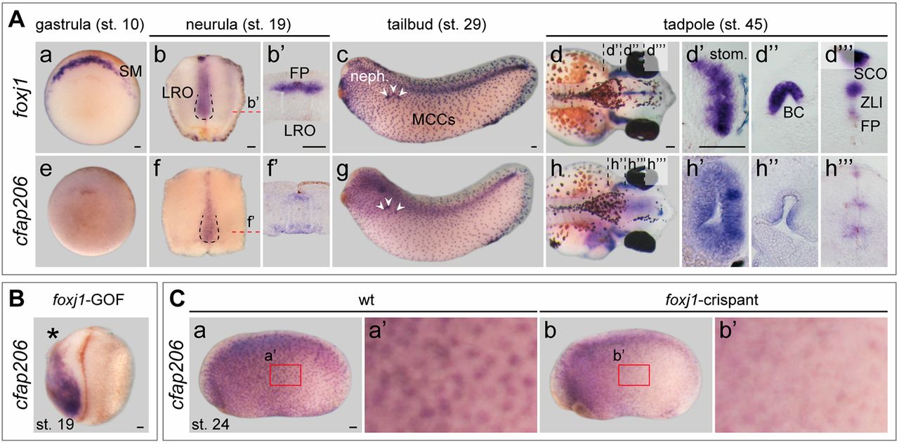 Fig. 2. cfap206 is co-expressed with and dependent on foxj1 in Xenopus laevis. (A) Analysis of foxj1 and cfap206 mRNA expression in staged embryos using antisense RNA probes. (a,e) In gastrula stage 10 embryos, foxj1 transcripts were present in the LRO precursor, the superficial mesoderm (SM; a), while cfap206 was not detected by in situ hybridisation (e). Histological sections (bâ²,fâ²; planes of sections indicated by red dashed lines in b,f) of stage 19 dorsal explants (b,f) revealed overlapping expression of foxj1 (b,bâ²) and cfap206 (f,fâ²) in the floor plate (FP), while in the gastrocoel roof plate (area of LRO; outlined by dashed lines in b,f), only cfap206 transcripts were detected. Staining in b reflects expression in the floorplate above the LRO. (c,g) In stage 29 larvae, both genes were co-expressed in the nephrostomes (white arrowheads) and MCCs. (d,h) In the head of stage 45 tadpoles, strong neural expression of foxj1 was seen in the sub-commissural organ (SCO), zona limitans intrathalamica (ZLI) and FP (dâ´). Transcripts of cfap206 were detected in the same tissues; however, at reduced levels (hâ´). Non-neural expression was found in the stomach (stom.; dâ²,hâ²) and in dorsal cells lining the branchial chamber (BC; dâ²,hâ²). (B,C) cfap206 is a foxj1 target gene. (B) Strong cfap206 induction in embryos unilaterally injected with foxj1 mRNA. Asterisk indicates injected side. (C) Reduction of cfap206 expression in stage 24 foxj1 F0 crispant embryos (b,bâ²) when compared with wild type (a,aâ²). Boxed areas in a,b indicate the regions shown at higher magnification in aâ²,bâ². Scale bars: 100â