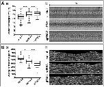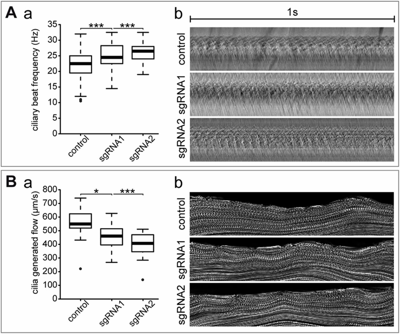 Fig. 4. Ciliary defects in MCCs of Xenopus cfap206 crispants. (A) Enhanced ciliary beat frequency (CBF) in crispants. (a) Statistical evaluation of CBF in wild-type and cfap206 crispants. Results from three independent experiments with 15 embryos each and five analysed MCCs per embryo. Raw data are shown in Table S3. (b) Kymographs of ciliary motility of single MCCs, generated from control wild-type, sgRNA1- and sgRNA2-injected specimens. (B) Reduced bead transport in cfap206 crispant skin mucociliary epithelia. (a) Velocities of bead transport in wild-type, sgRNA1- and sgRNA2-injected specimens. Results from three independent experiments with eight analysed specimens each. Raw data are shown in Table S2. (b) Maximum intensity projections of single control wild-type, sgRNA1- and sgRNA2-injected embryos. The boxplots show values between the first and third quartile (boxes), with the whiskers displaying ± 1.5à the interquartile range (IQR); i.e. box length=IQR=Q3ÃQ1; upper whisker=Q3+1.5ÃIQR, lower whisker=Q1Ã1.5ÃIQR. *PP |
