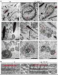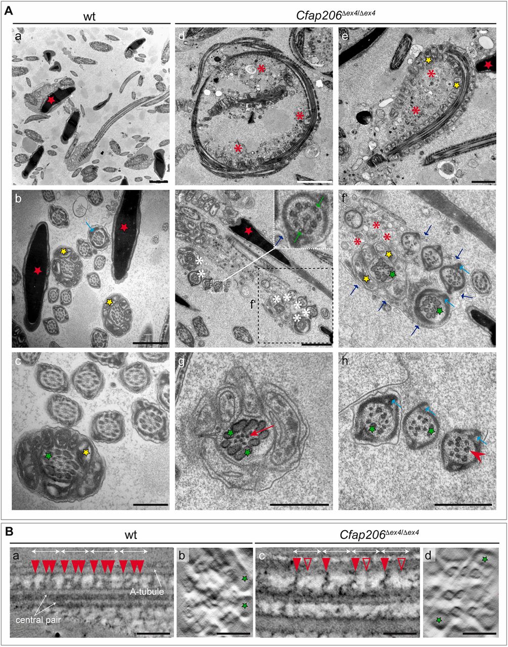 Fig. 8. Electron microscopic analysis of wild-type and Cfap206Îex4/Îex4 mutant sperm. (A) TEM analysis of wild-type (a-c) and Cfap206Îex4/Îex4 (d-h) epididymis sperm. (a-c) Overviews of wild-type sections; red stars, sperm heads; blue arrow, fibrous sheath; yellow star, mitochondria; green stars, ODFs. (d,e) Longitudinal section through Cfap206Îex4/Îex4 circular (d) or bent (e) axonemes surrounding vesicular material (red asterisks). (f) Groups of axonemes (marked with white asterisks) surrounded by a single plasma membrane (dark-blue arrows in fâ², magnified region of the black outlined area in f) and axonemal profiles with apparently normal microtubule doublets (green arrows in white outlined inset). (fâ²) Vesicular structures (red asterisks) and multiple axonemal profiles from the midpiece and principal piece region [indicated by the presence of mitochondria (yellow stars) and fibrous sheath (light-blue arrows)] with disorganized microtubules and ODFs (green stars) surrounded by a single plasma membrane (dark-blue arrows). (g) Axonemal profile of the midpiece region showing few irregular single microtubules (red arrow) and ODFs (green stars). (h) Axonemal profiles of principal pieces with disorganized ODFs (green stars) and microtubules surrounded by fibrous sheaths (light-blue arrows). (B) Electron tomography revealed radial spokes (red arrowheads) between the inner central pair of microtubules and the outer microtubules (anchored at the A-tubule) in wild type (a). Radial spokes (red arrowheads, RS1-3) appeared in a repetitive pattern, interrupted by electron lucent gaps repeating every 96â