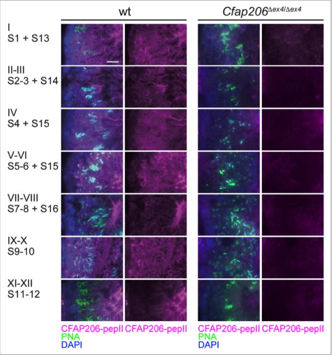 Fig. 5. Generation and characterisation of a Cfap206-null mouse. (A) Schematic drawing depicting the structure of the targeted locus, the locus after FLP-mediated removal of the neo cassette (Cfap206loxP) and following Cre-mediated excision of exon 4 (Cfap206δex4). (B) Western blot analysis of testis lysates of wild-type and Cfap206δex4/δex4 mice with anti-pepI and anti-pepII antibodies demonstrated absence of both CFAP206 protein variants in mutant tissue. Arrows indicate the expected sizes of the CFAP206 proteins. The full-size western blots are shown in Fig. S10. (C) Indirect immunofluorescence staining of wild-type (a-f) and Cfap206δex4/δex4 (g-l) testis (a-c,g-i) and respiratory epithelium (d-f,j-l) sections for CFAP206, indicating loss of staining in mutant tissues. (D) Analysis of cilia length in mouse tracheal epithelial cells (mTECs) isolated from wild-type and Cfap206δex4/δex4 mutants revealed no change in ciliary length upon CFAP206 loss. Each dot represents the average cilia length of one specimen analysed (n=3). Graph in D displays respective values as mean±s.d. Raw data are shown in Table S4. Scale bars: 10â