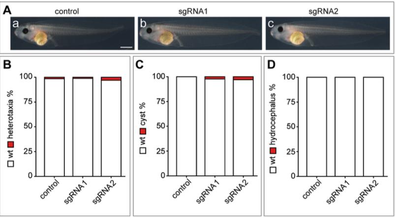 High-speed (800 frames per second (fps)) videography of single MCCs at stage 32. Left: wild type (control); middle: sgRNA1 crispant; right: sgRNA2 crispant. Note that cilia were motile in all cases. Movie plays at 15 fps, i.e. at about 0.02x real time. |