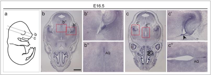 Fig. 6. Enlarged ventricles and mucus accumulation in Cfap206δex4/δex4. (A) External views (a,b) and Hematoxylin and Eosin-stained coronal sections (c,d) of wild-type (a,c) and Cfap206δex4/δex4 (b,d) heads revealed domed skull, and expanded and fused ventricles of Cfap206δex4/δex4 mutants. (B) Hematoxylin and Eosin-stained coronal sections of wild-type (a-bâ²) and Cfap206δex4/δex4 mutant (c-dâ²) brains demonstrated the presence of enlarged ventricles on postnatal day 1 (P1). Boxed areas in a-d indicate the regions shown at higher magnification in aâ²-dâ². (C) (a) Schematic representation of a P6 brain. Red line indicates plane of section. The mid-sagittal sections of heterozygous Cfap206δex4 (representing wild-type condition; b) and homozygous Cfap206δex4 mutants (c,d) were Hematoxylin and Eosin stained to visualise the aqueduct (AQ). Homozygous mutants showed stenotic (black arrowhead in c) or obstructed (red arrowhead in d) aqueducts. (D) Cilia-generated ventricular flow at P7 was comparable in wild-type and Cfap206δex4/δex4 littermates. Each dot represents the average speed of all tracked particles of a single individual (wild type n=8 and Cfap206δex4/δex4 n=12). Numerical values used to generate the dot plot are shown in Table S5. (E) Coronal sections of wild-type (a-câ²) and Cfap206δex4/δex4 mutant (d-fâ²) nasal cavities, demonstrating progressive mucus accumulation in mutants. Boxed areas in a-f indicate regions shown at higher magnification in aâ²-fâ². (F) Kymographs and derived CBF. (a) Representative kymographs (upper panels) and plotted values (lower panels) of wild-type (violet) and Cfap206δex4/δex4 (green) tracheal cilia motility (t=1â