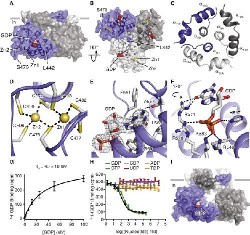 Figure 6. The P2X7 Cytoplasmic Ballast Contains a Dinuclear Zinc Ion Complex and a High-Affinity Guanosine Nucleotide Binding Site (A) The cytoplasmic ballast from each protomer lies beneath the TM domain from an adjacent protomer. (B) The entire cytoplasmic domain, viewed perpendicular to the membrane from the cytoplasm. Residues S443–R469 are missing from the apo state structure, visualized here, because no density is present in the map. (C) A bottom-up view focused on the center of the cytoplasmic domain, perpendicular to the membrane from the cytoplasm, reveals how, in the context of a trimer, helices α12 and α13 of each cytoplasmic ballast form a hexagonal hole (diameter, ∼14 Å) through which the α9 helix from each protomer (labeled A, B, and C) emerges. This is referred to as the cytoplasmic plug. The entire cytoplasmic domain assembles as a trimer, in part through the interactions at the interface formed by helices α9, α12, and α13. (D) The cytoplasmic dinuclear Zn2+ ion complex is coordinated by seven cysteine residues in a tetrahedral geometry. (E and F) The cytoplasmic guanosine nucleotide binding site, occupied by a GDP molecule, shown in two views highlighting the density for GDP (E) and key interactions made with conserved P2X7 residues (F). (G) Measurement of 3H-GDP saturation binding to the purified, detergent-solubilized rP2X7 receptor using SPA. The Kd for GDP binding was directly measured as 40 ± 10 nM. Error bars represent the standard deviation of three measurements. (H) Inhibition of 3H-GDP binding to the rP2X7 receptor by guanosine nucleotides yields Ki values of 70 ± 10 nM and 150 ± 15 nM for GDP and GTP, respectively. Non-guanosine diphosphate nucleotides do not displace 3H-GDP and thus do not bind to the cytoplasmic domain of the P2X7 receptor. Error bars represent the standard deviation of three measurements. (I) The guanosine nucleotide binding pocket is exposed at the interface between two cytoplasmic ballasts, accessible as a docking site for protein-protein interactions. Each protomer is a different color. |