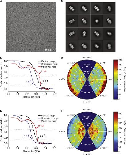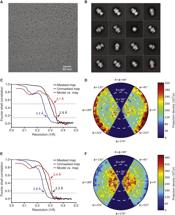 Figure S3. Cryoelectron Microscopy Analysis of Full-Length rP2X7 in the Apo and Open States, Related to Figures 1 and S2 (A) Representative electron micrograph of the apo state rP2X7 data. (B) Selected two-dimensional class averages of the electron micrographs of the apo state rP2X7 data. (C, E) The gold-standard Fourier shell correlation curves for the electron microscopy maps of the apo state data (C) and the open state data (E) of rP2X7 are shown in black for the masked map and blue for the unmasked map, and the Fourier shell correlation curves between the atomic model and the final electron microscopy maps are shown in red. (D, F) Angular distribution of particles used for the refinement of the apo state data (D) and the open state data (F). |