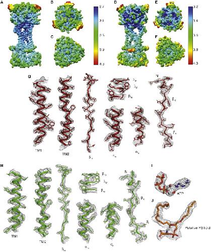 Figure S4. Local Resolution Estimates and Representative Densities of the Reconstructions for the Apo-State and Open-State Data of rP2X7, Related to Figures 1, 4, and S2 (A-F) Local resolution estimation of the reconstructions shown as a side view, a top down view from the extracellular surface, and a bottom up view from the cytoplasmic surface, respectively, for the apo state data (A-C) and open state data (D-F) of rP2X7 receptor. (G, H) Representative protein densities from different regions of the apo state (G) and open state (H) maps of rP2X7 receptor. (I, J) Densities for ATP (I) and putative PS phospholipid (J) in the open state map |