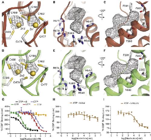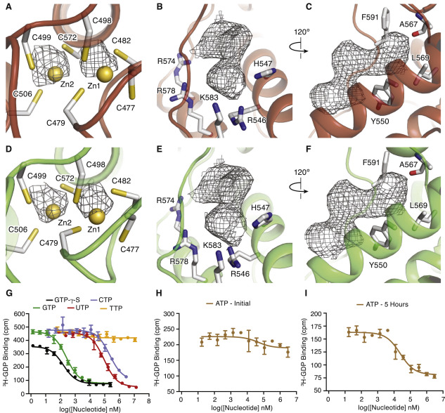 Figure S6. The Dinuclear Zinc Ion Complex, GDP Nucleotide Densities, and Nucleotide Triphosphate Binding in the Cytoplasmic Ballast of rP2X7 Structures, Related to Figures 1, 5, 6, and S2 (A-F) The cytoplasmic ballast of rP2X7 receptor contains density features in the reconstructions that represent the unexpected findings of a zinc ion complex with two Zn2+ ions (Zn1 and Zn2) and a GDP molecule, respectively, for both the apo state (A-C) and open state (D-F) datasets. (A, D) The zinc ion densities are still present when the maps are contoured to a threshold (σ = 25) where the protein density is no longer clearly visible. (B-C, E-F) The residues surrounding the density make interactions consistent with those expected for GDP. Specifically, R546, K583, and R578 make ionic interactions with the phosphates, R574 and the carbonyl of A567 make hydrogen-bonding interactions with the guanine base, and residues L569, Y550, and F591 contribute van der Waal’s interactions to the guanine base. Each of these residues is conserved in human P2X7. The apo state structure is shown in red (B-C) and the open state structure is shown in green (E-F). The densities shown are from the apo and open state maps obtained using a mask that included the TM and cytoplasmic domain, but excluded the extracellular domain (focused refinement on the cytoplasmic domain). (G) Inhibition of 3H-GDP binding to rP2X7 receptor by guanosine nucleotide triphosphates yields Ki values of 150 ± 15 nM and 100 ± 10 nM for GTP and GTP-γ-S, respectively. Non-guanosine nucleotide triphosphates show significantly lower binding affinity – nucleotides UTP and CTP inhibit 3H-GDP binding to rP2X7 receptor with Ki values of 60 ± 10 μM and 130 ± 3 μM, respectively. Nucleotide TTP does not displace 3H-GDP and thus does not bind to the cytoplasmic domain of P2X7 receptor. (H-I) Nucleotide ATP shows a time-dependent displacement of 3H-GDP from the cytoplasmic domain of P2X7 receptor. While no displacement of 3H-GDP occurs initially (H), an ATP-induced displacement of 3H-GDP (Ki value of 22 ± 10 μM) can be measured after several hours (I). A time-dependent change in the displacement of 3H-GDP did not occur with any other nucleotide. Because ATP also binds to the extracellular domain of P2X7 receptor in the orthosteric ATP binding pocket, further studies are needed to determine if the time-dependent displacement of 3H-GDP is due to direct displacement from ATP binding to the cytoplasmic domain or from allosteric modulation, whereby the affinity of 3H-GDP binding to the cytoplasmic domain is decreased after ATP binds to the extracellular, orthosteric ligand binding pocket. Error bars represent the standard deviation of three measurements. |