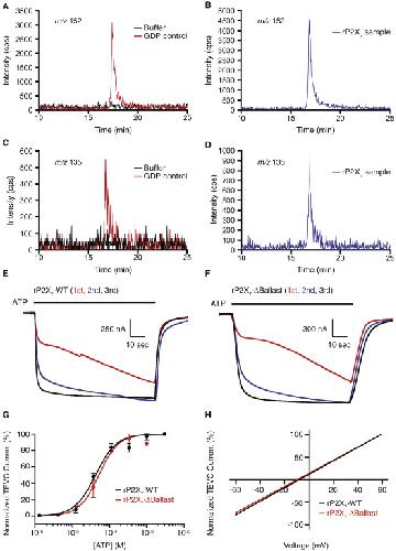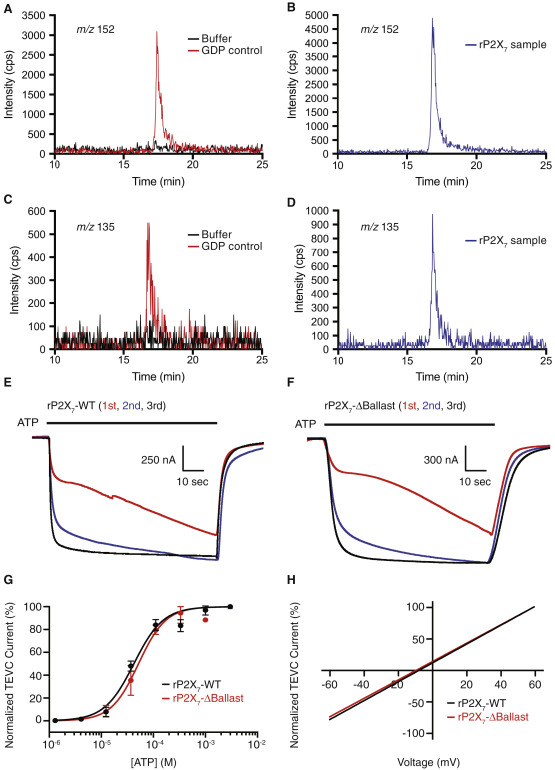 Figure S7. GDP Detection Using MRM and Functional Assessment of the Cytoplasmic Ballast, Related to Figures 5 and 6 (A-D) Liquid chromatography tandem mass spectrometry analysis on a purified rP2X7 receptor preparation using multiple reaction monitoring (MRM) of fragment ions (m/z 135 and m/z 152) produced from the parent ion (m/z 444) in positive ESI mode confirm the identification of GDP nucleotide. MRM monitoring ion fragment m/z 152 and ion fragment m/z 135, respectively, for buffer and GDP control (A, C) compared to the receptor sample (B, D). The retention time and ratio of the two ions are consistent with GDP nucleotide. No other nucleotides were detected. (E-H) The functional aspects of rP2X7-ΔBallast are nearly identical to rP2X7-WT with respect to kinetics of activation, lack of desensitization, affinity for ATP, and ion selectivity. (E-F) Both rP2X7-WT (E) and rP2X7-ΔBallast (F) show similar current facilitation, and no desensitization, with repeated exposure to 100 μM ATP (1 minute, black bar) at one minute intervals, for three exposures. (G) ATP-activated dose-response curves for rP2X7-WT (black trace) and rP2X7-ΔBallast (red trace), performed in the absence of divalent cations, show similar EC50 values of 42 ± 3 μM and 52 ± 11 μM, respectively. Error bars represent the standard deviation of three measurements. (H) The ATP-induced (100 μM) two electrode voltage clamp currents for rP2X7-WT (black trace) and rP2X7-ΔBallast (red trace) reversed sign at −8 ± 1 mV and −10 ± 3 mV, respectively. Error bars represent the standard deviation of three measurements. |
