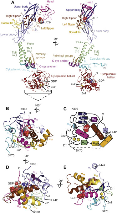 Figure 5. P2X7 Cytoplasmic Domain; the Cytoplasmic Ballast Contains a Novel Fold (A) Ribbon representation of one subunit of the open state structure of rP2X7 receptor, shown in orthogonal views. Each of the major P2X7 domains is color coded. The cytoplasmic cap, C-cys anchor, and cytoplasmic ballast domains are highlighted. (B) Ribbon representation of the cytoplasmic ballast of rP2X7 receptor, displaying the secondary structure elements, the two zinc ions, and the guanosine nucleotide. (C) Topology diagram of the cytoplasmic ballast, shown in the same orientation as in (B), revealing a novel fold without structural homology in the PDB. Dashed lines denote un-modeled regions. (D and E) Additional ribbon representations of the cytoplasmic ballast of the rP2X7 receptor, shown in two different orthogonal views from (B), highlighting the relative locations of the zinc ions and the guanosine nucleotide within the ballast fold. The models are missing residues S443–R469 in the apo state and residues S443–R471 in the open state. |