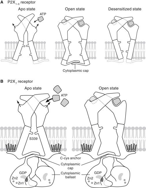 Figure 7. Molecular Mechanism of P2X Receptor Gating (A and B) Cartoon models summarizing the gating mechanism for the desensitizing P2X1–6 receptor subtypes (A) compared with the non-desensitizing P2X7 receptor subtype (B). |