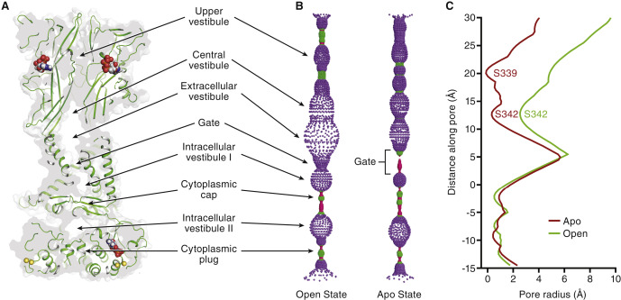 Figure S5. The Pore-Lining Surface of rP2X7 for the Open and Apo States, Related to Figure 2 (A) Coronal section of a surface representation of the open state of rP2X7 reveals five vestibules (upper, central, extracellular, intracellular vestibule I, and intracellular vestibule II) are located on the molecular three-fold axis. Beyond the TM gate, two additional sites of constriction exist along the three-fold axis (cytoplasmic cap and cytoplasmic plug). (B) Pore-lining surface along the entire axis of rP2X7 for open and apo states. The color of each sphere represents a different radius from the receptor center, as calculated by the program HOLE: reddish pink < 1.15 Å, green between 1.15 – 2.30 Å, and purple > 2.30 Å. (C) Plot of pore radius as a function of distance along the pore axis (focused around the TM gate) for the apo state versus the open state of rP2X7. The positions of the residues making up the narrowest radius for the TM gate in each conformational state are labeled. The Cα position of residue L353 is set as zero. |
