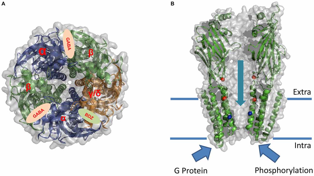 Figure 2. Sites of action for allosteric modulation of GABAAR. Schematic illustration of the overall architecture and putative modulatory sites of action on GABAAR. The model is based in the X-ray structure of GABAAR β3 subunit (PDB: 4COF; see Miller and Aricescu, 2014). (A) Upper view of the putative subunit stoichiometry and global architecture of the αβγ/δ GABAAR. The cartoon shows the binding sites for GABA and Benzodiazepine (BDZ). (B) Lateral view showing the suggested binding sites for ethanol (red spheres) and Picrotoxin (blue spheres). This crystal structure lacks the intracellular domain between TM3 and TM4 which was shown to be critical for the modulation of the receptor by G protein and phosphorylation pathways. |