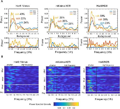 Figure EV4. Frequency analysis of Her6::Venus observed in progenitors in the presence and absence of miR‐9 regulation. Related to Fig 4