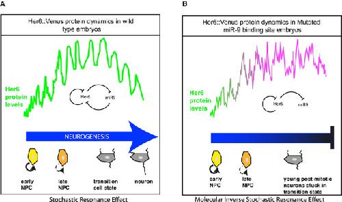 Dynamic properties of noise and Her6 levels are optimized by miR-9, allowing the decoding of the Her6 oscillator.