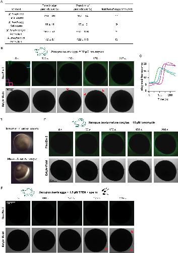 Fig 1. X. laevis eggs release zinc at fertilization, which protects eggs from additional fertilizations. (A) Representative fluorescence and bright-field images of X. laevis eggs in FluoZin-3 before and after sperm application. Time is relative to sperm addition. Zinc release coincided with lifting of the envelope (red arrowheads and insert) (N = 16 eggs, 4 trials). (B) Integrated fluorescence relative to time of sperm addition and detected by region of interest analysis, indicated by colored boxes in panel (A). (C) Representative images of X. laevis eggs and embryos. (D) Box plot distribution of zinc ions released per X. laevis egg upon fertilization or activation with 10 μM ionomycin as detected by FluoZin-3 fluorometry. (E-G) Proportion of inseminated eggs that developed cleavage furrows in indicated concentrations of ZnSO4, ZnCl2, or MgSO4. Plots in (A) and (B) were fit with sigmoidal functions. (H) Proportion of development of eggs subjected to a 15-minute pretreatment with 0 or 300 μM ZnSO4 (solution 1) then washed and moved to solution (2) with 0 or 300 μM TPEN for sperm addition (N = 68â259 eggs, 5 trials). (I) Incidence of cleavage furrow development from eggs inseminated in 0 or 1 mM ZnSO4 and then transferred to a new solution with 0 or 1 mM ZnSO4 30 minutes after sperm addition (N = 52â258 eggs in 6 trials). (J) Proportion of cleavage furrow development from eggs inseminated in and transferred to control conditions (black), eggs inseminated in 300 μM ZnSO4 and transferred to 600 μM TPEN 30 minutes following sperm addition (purple), or eggs inseminated in and transferred to 1 mM ZnSO4 (red) (N = 26â58 eggs in 7 trials). (E-J) Errors are SEM. For full source data, see S1 Data. TPEN, N,N,Nâ²,Nâ²-tetrakis(2-pyridinylmethyl)-1,2-ethanediamine. |