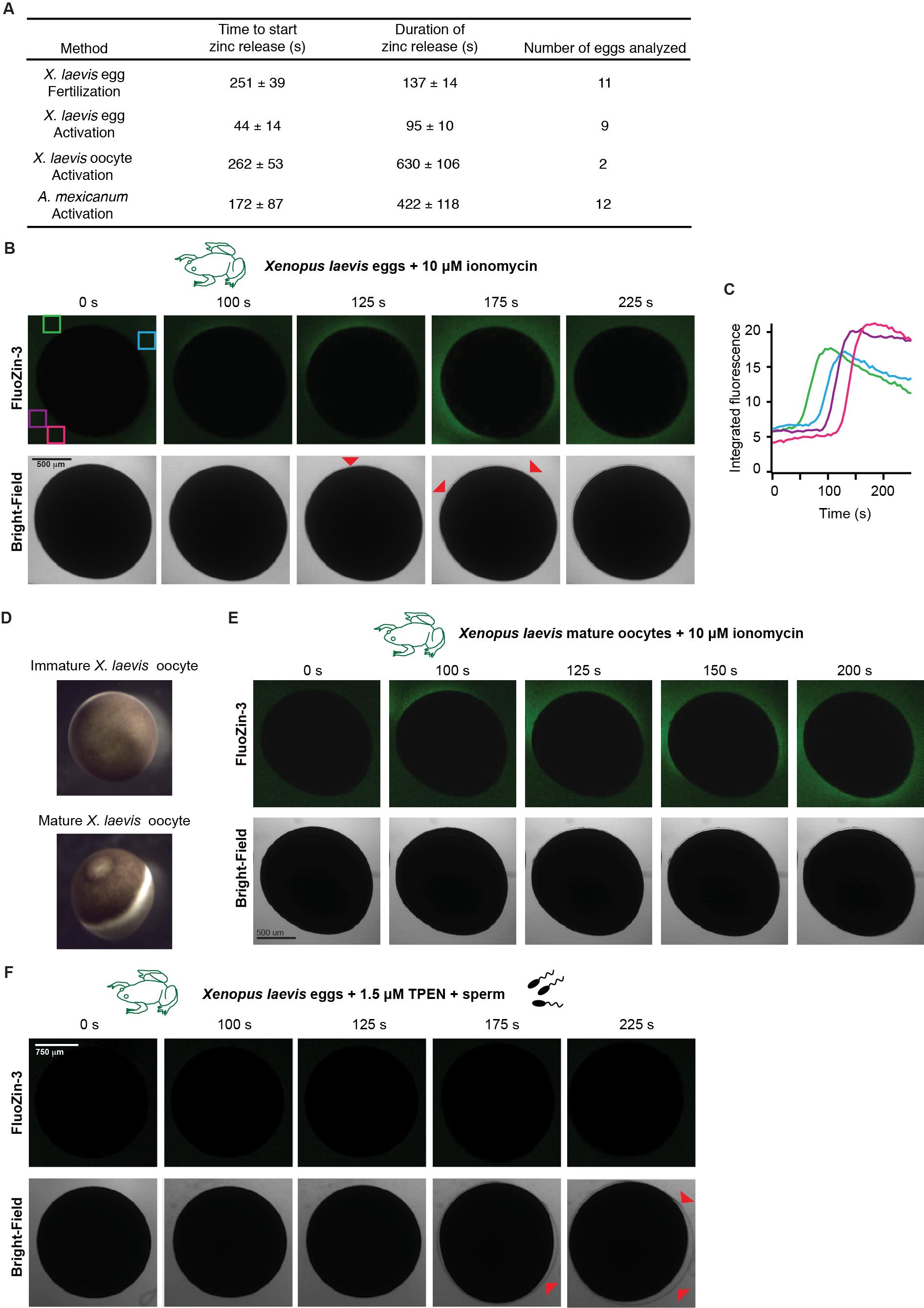 S1 Fig. Activation in the absence of fertilization promotes zinc release from X. laevis eggs and oocytes. (A) Kinetics of zinc release in activation of X. laevis and A. mexicanum eggs and oocytes. (B) Parthenogenic activation of X. laevis eggs (N = 9 eggs, 5 trials) or in vitro matured oocytes (E; N = 9 eggs, 3 trials) with 10 μM ionomycin in the presence of FluoZin-3 also induced zinc exocytosis. Red arrowheads highlight the lifting of the fertilization envelope (B, F). (C) Changes in FluoZin-3 fluorescence upon parthenogenic activation were detected by region of interest analysis. Integrated fluorescence relative to time of ionomycin addition, detected by region of interest analysis (indicated by colored boxes in upper left image). (D) Representative images of immature and in vitro matured oocytes. (F) Treatment of X. laevis eggs in FlouZin-3 with the zinc chelator TPEN abolished fertilization-induced zinc release (N = 8 eggs, 2 trials). For full source data, see S1 Data. https://doi.org/10.1371/journal.pbio.3000811.s001 |