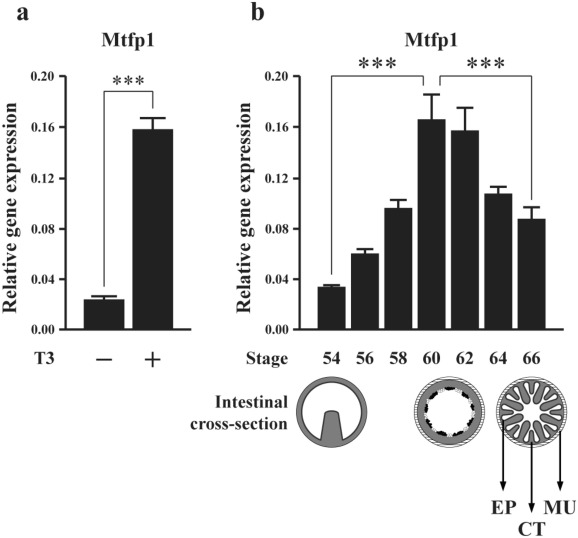 Fig. 1. Xenopus tropicalis Mtfp1 is upregulated during natural and T3-induced metamorphosis. (a) The mRNA levels of Mtfp1 during T3-induced metamorphosis. Premetamorphic stage 54 tadpoles were treated for 2 days with 10 nM T3 and total RNA was isolated from the intestine for qRT-PCR analysis (n = 3). (b) Mtfp1 mRNA level during natural metamorphosis. Total RNA was isolated from the intestine of tadpoles at indicated stages and subjected to qRT-PCR analysis (n = 3). Diagramed below the expression data are schematics of the intestine at indicated stages. The intestine at stage 54 has a simple structure with a single epithelial fold, the typhlosole, surrounded by thin layers of connective tissue and muscles. At the metamorphic climax stages 60–62, the larval epithelial cells undergo apoptosis, as indicated by the open circles, and adult stem cells, as indicated by black dots, are formed and proliferating. By stage 66, the newly formed adult epithelium (EP) has many folds, surrounded by thick layers of connective tissue (CT) and muscles (MU). L: intestinal lumen. All data are shown in mean ± S.E.M. (***P ≤ 0.005).