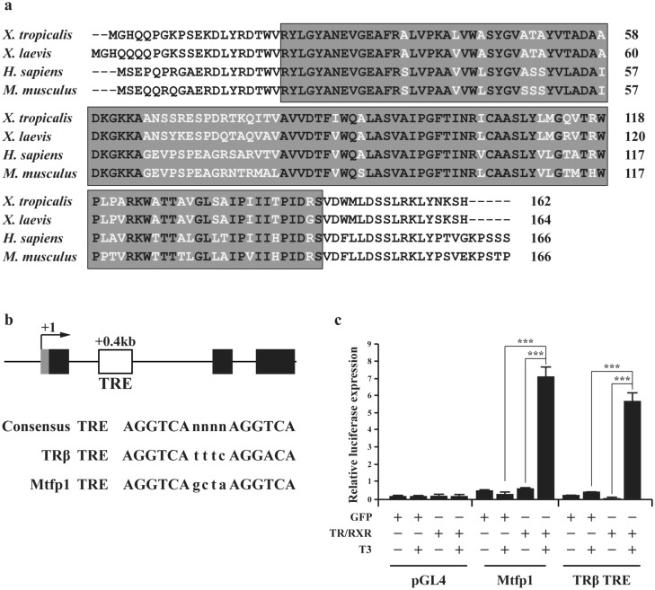 Fig. 2. The MTP18 domain of Mtfp1 is highly conserved and Xenopus tropicalis Mtfp1 promoter is regulated by TR via an intronic TRE in vivo. (a) Amino acid alignment of Mtfp1 from X. tropicalis, X. laevis, H. sapiens and M. musculus. The boxed region is the MTP18 domain. Shaded amino acids indicate conserved residues. (b) Schematic diagram of the Mtfp1gene with a putative TRE (white box) in the first intron. Gray box shows the putative 5′ UTR and black boxes are exons. The putative TRE is located at + 371 bp from the putative transcription start site. The TRE of the TRβ gene is shown for comparison. (c) Activation of the Mtfp1 promoter by liganded TR in the reconstituted oocytes. The reporter construct had the Mtfp1 promoter, including the TRE in the first intron, driving the expression of firefly luciferase. The internal control was the Renilla luciferase reporter phRG-TK vector. pGL4 was a negative control for promoter activity, and TRβ promoter construct was a positive T3-response promoter control. GFP was used as a control for TR/RXR mRNA. The oocytes were injected with indicated mRNA and reporter construct and harvested for luciferase assay (n = 3). The data are shown mean ± S.E.M. (***P ≤ 0.005).