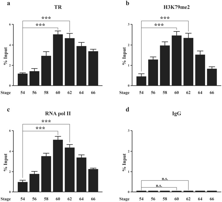 Fig. 5. TR binding to the TRE region peaks in the intestine at the climax of metamorphosis, accompanied by peak levels of RNA polymerase II and H3K79 methylation during natural metamorphosis. ChIP assay were done on tadpole intestine at different stages with the antibody against the antigen indicated on each panel or control IgG (n = 3). (a) TR binding to Mtfp1 TRE increases at metamorphic climax (stage 60 and 62) before dropping to a lower level by the end of metamorphosis. (b)/(c) The changes in the levels of dimethylated H3K79 (b) and RNA polymerase II (c) at the TRE region parallel that in TR binding. (d) The negative control IgG ChIP yields only background signals throughout metamorphosis. The data are shown in mean ± S.E.M. (***P ≤ 0.005. n.s. not significant).