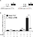 Fig. 3. TR activates Mtfp1 transcription though putative TRE when T3 is present. (a) Schematic diagrams of the Mtfp1 promoter construct containing wild type TRE (Mtfp1 TRE) or a mutant TRE (Mtfp1 mTRE). The TRE sequences are shown in capital letters with the mutated position in red. (b) The promoter with wild type Mtfp1 TRE but not mTRE is activated by T3 in the presence of T3 when TR and RXR were expressed in Xenopus laevis oocytes. The oocytes were injected as indicated and harvested for luciferase assay (n = 3). The data are shown mean ± S.E.M. (***P ≤ 0.005; n.s. not significant).