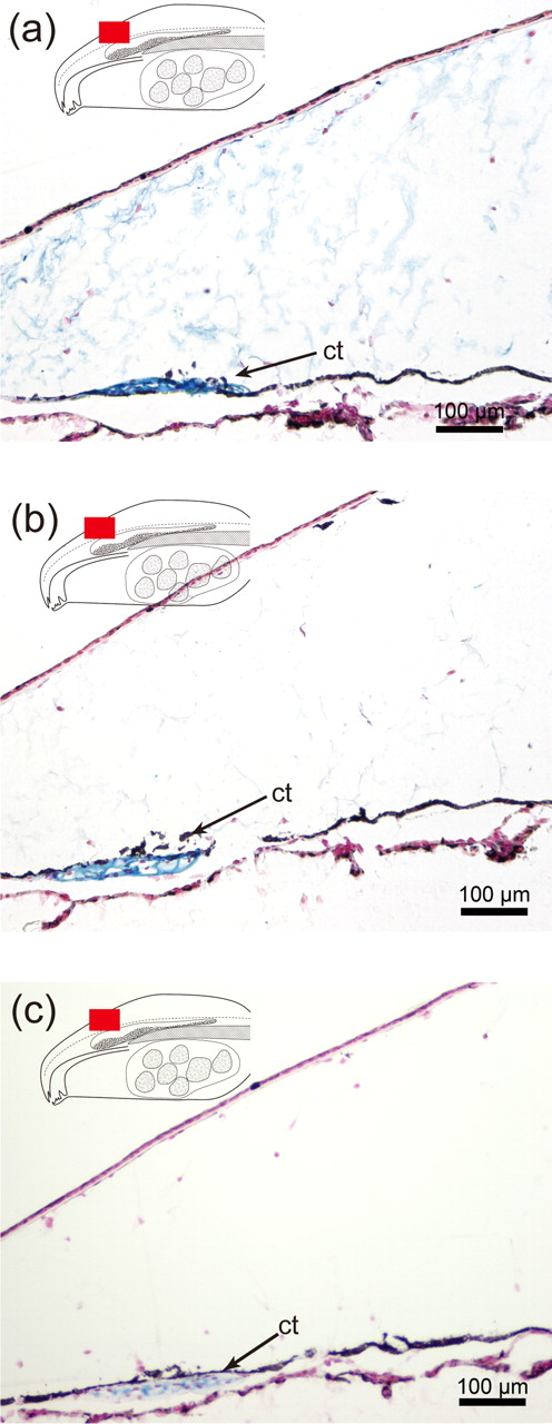 (a) Section stained at pH2.5, (b) section stained at pH1.0, (c) section stained at pH2.5 after hyaluronidase treatment. Ct, cartilage.