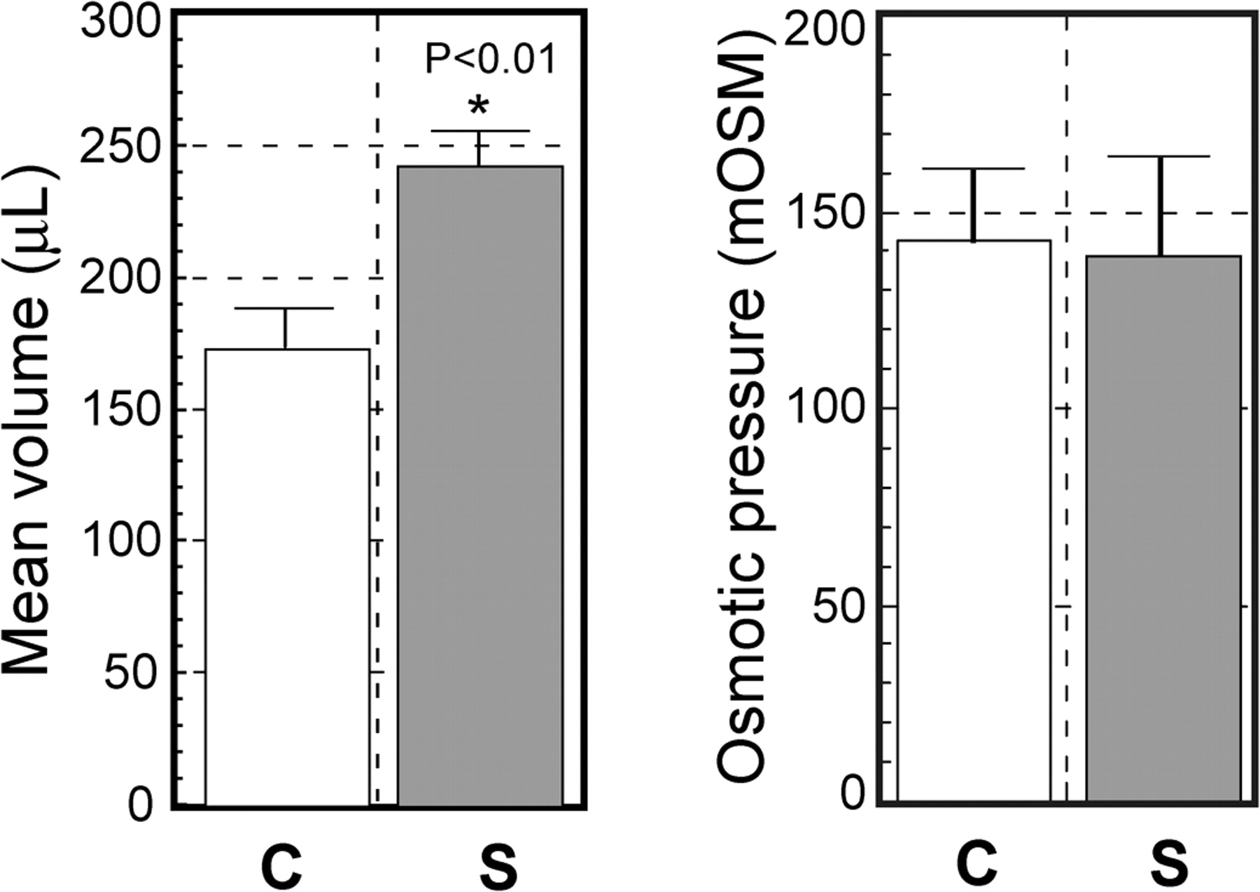 Tadpoles were homogenized using a Polytron (Kinematica) and the homogenate centrifuged at 15,000â rpm for 30â min at 4°C. The total volume of supernatant from each tadpole was measured using a micropipette (nâ=â24 control (C); nâ=â25 bulgy morph (S) stimulated by predator); osmolarity was measured using the supernatant (nâ=â14 control; nâ=â15 bulgy morph). Vertical bars represent standard errors, and * indicates a significant difference by Student's t test (p<0.01).
