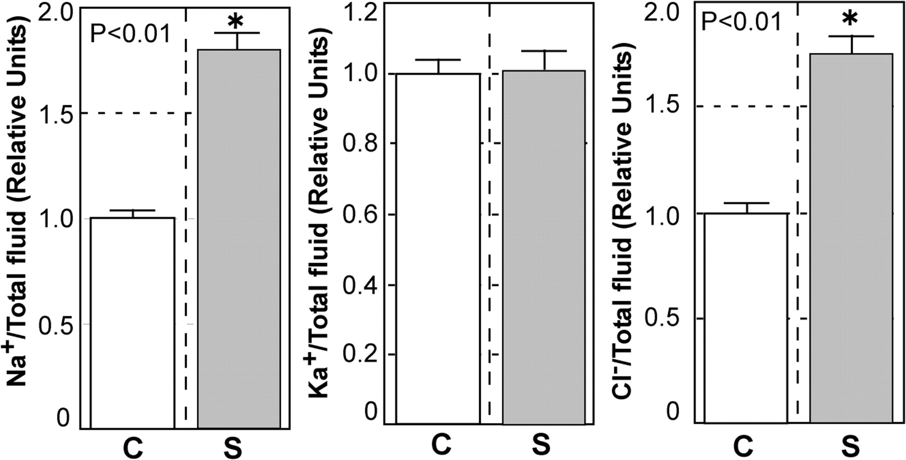 Tadpoles were homogenized using a Polytron (Kinematica) and the homogenate was centrifuged at 15,000 rpm for 30 min at 4°C. Na, K, Cl ion concentrations were measured in the supernatants of control (C) and bulgy morph (S) tadpoles (C, n = 16; S, n = 21); the data are expressed as values relative to control levels. Vertical bars represent standard errors, and * indicates a significant difference by Student's t test (p<0.01).