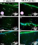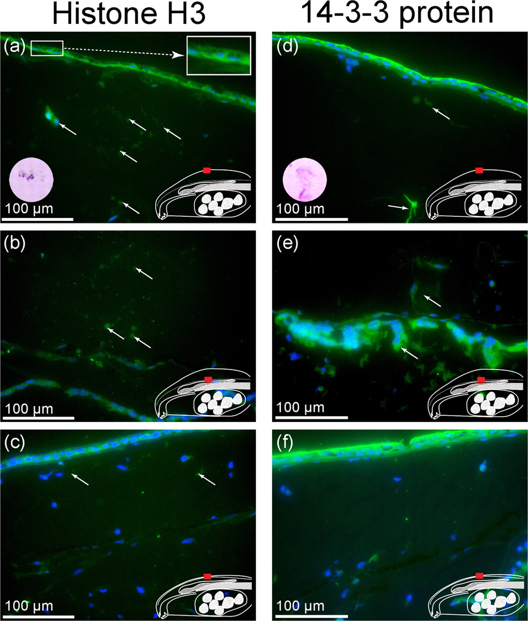 Sections were incubated with anti-histone H3 antibody (a,b,c) or anti-14-3-3 zeta antibody (d,e,f). (a,d) Parietal surface of bulgy morph tadpole. (b,e) Deeper structures of the parietal region of the bulgy morph tadpole. (c,f) Surface and deeper structure of parietal region of control tadpoles. Arrows indicate stained proteins, the superimposed circular images show HE staining of material stained by each antibody.