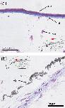 The relative position of each image on the section is identified by the region highlighted in red in the superimposed line drawing. (a,b) Mallory-Azan staining of the parietal region. In (a), a typical region of the parietal surface is shown, while (b) shows the structure of a deeper part of the parietal region. bl, basal lamella; fb, fibroblast; cell, connective tissue cell; pg, pigment granule; se, squamous epithelium.