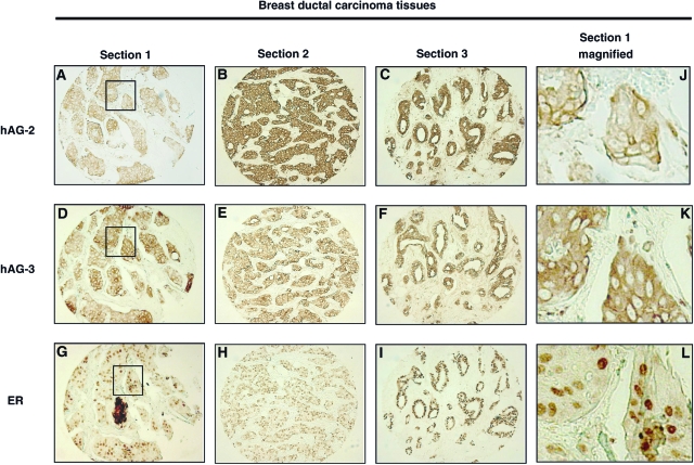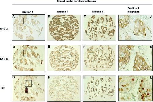 Figure 2. Immunohistochemical analysis of hAG-2, hAG-3, and ER protein in three separate breast ductal carcinoma donor tissue sections. The boxed region in panels A, D, and G is magnified in panels J, K, and L, demonstrating cytoplasmic staining of hAG-2 (J) and hAG-3 (K) and nuclear staining of ER (L).