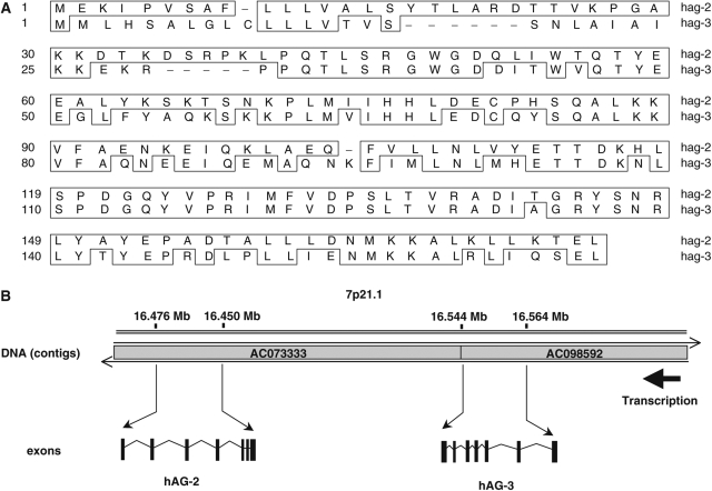 Figure 1. hAG-2 and hAG-3 show close homology at the protein level and are adjacent to each other at chromosome position 7p21. (A) Protein sequence alignment of hAG-2 and hAG-3 (DNAStar MegAlign program–Jotun Hein alignment). The boxed regions on the hAG-3 sequence indicate exact amino-acid matches of hAG-3 with hAG-2. (B) Diagram illustrating the genomic locations, transcriptional orientation, and exon structures of hAG-2 and hAG-3 on chromosome 7p21.