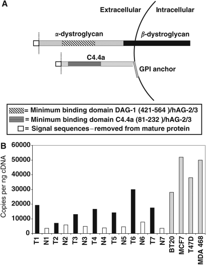 Figure 4. (A) Diagrammatic illustration of DAG-1 and C4.4a proteins showing the extracellular hAG-2 and hAG-3 minimum binding domains identified by yeast two-hybrid analyses. Although both structures are shown attached to the same cell, it is likely that the interactions of the hAG proteins are autocrine in nature for C4.4a and paracrine for DAG-1. (B) Real-time quantitative RT–PCR analysis of C4.4a mRNA expression in seven donor-matched adjacent normal (N) and tumour (T) breast samples (indicated 1–7) and four human breast cancer-derived cell lines. C4.4a is upregulated in all of the tumour samples, relative to their matched normal tissue, and expressed in all the breast cancer cell lines used to create the yeast two-hybrid prey library. Expression values are described as copies per nanogram of cDNA derived from a standard curve of known dilutions of C4.4a DNA.