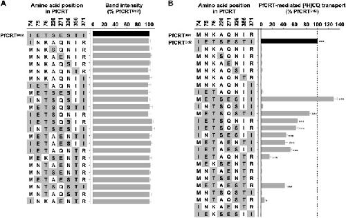 Fig 3. Experimental characterization of the 24 combinatorial variants.(A) The level of PfCRT protein in the oocyte membrane was semi-quantified using an established western blot approach [24]. The analysis included PfCRTDd2 as a positive control, to which the other band intensity values were normalized. Sample loading and transfer of the proteins were evaluated by total protein staining of the nitrocellulose membrane. The data are the mean + SEM of at least three independent experiments (performed using oocytes from different frogs), within which measurements were averaged from two independent replicates. There were no significant differences in expression levels between the 24 variants of PfCRT (P > 0.05; one-way ANOVA). That is, all of the PfCRT variants were present at similar levels in the oocyte membrane and any differences in CQ transport activity between these proteins are thus attributable to the mutations they carry, rather than differences in expression levels. (B) [3H]CQ transport was measured at pH 5.5 and in the presence of 15 μM unlabeled CQ. The direction of CQ transport in oocytes is equivalent to the direction of CQ transport in the malaria parasite (S1 Fig). The PfCRT-mediated component of CQ transport was calculated by subtracting the level of CQ accumulation detected in non-expressing oocytes (the negative control) from that measured in oocytes expressing a PfCRT variant. The rate of PfCRT-mediated transport was then expressed relative to that measured in oocytes expressing PfCRTDd2 (the positive control). The data are the mean + SEM of at least three independent experiments (performed using oocytes from different frogs), within which measurements were made from 10 oocytes per treatment. The asterisks denote a significant difference in CQ transport between oocytes expressing PfCRT3D7 (the wild-type isoform) and oocytes expressing another variant of PfCRT: *, P < 0.05; ***, P < 0.001 (one-way ANOVA or Studentâs t-test). In both panels, the data for IEKSESII (i.e. the â106/1â isoform of PfCRT) was taken from Richards et al., 2016 [75]. The presence at the oocyte plasma membrane of the variants of PfCRT lacking significant CQ transport activity was confirmed via immunofluorescence assay (S2 Fig, S3 Fig). |