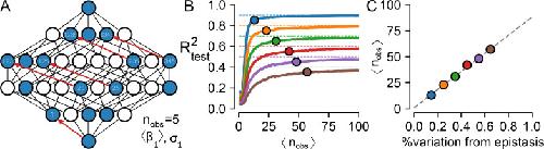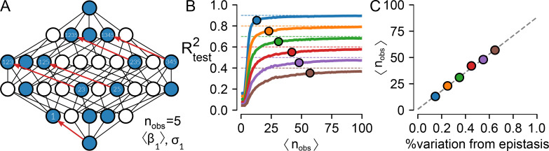 Fig 5. Epistasis as uncertainty.A) Schematic of a generic, partially characterized map. The nodes represent genotypes, some of which have been measured (blue) whereas others have not (white). Lines represent single point mutations. Given these observations, we measure the effect of “mutation 1” in five different backgrounds (red arrows) and can thus calculate the mean and variance in its effect across the map (〈β1〉 and σ1). B) R2test versus the average number of times each mutation is seen in sampled genotype-phenotype maps with epistasis responsible for 10% (blue) to 60% (brown) of the variation in the maps. Points indicate where the R2test is within 5% of the maximum predictive power of the additive model. C) A calibration curve indicating how many times, on average, one must observe each mutation in a map to resolve the additive coefficients with different fractions of epistasis. |