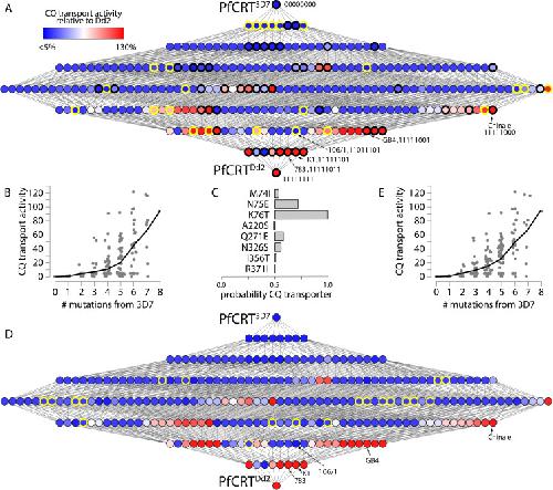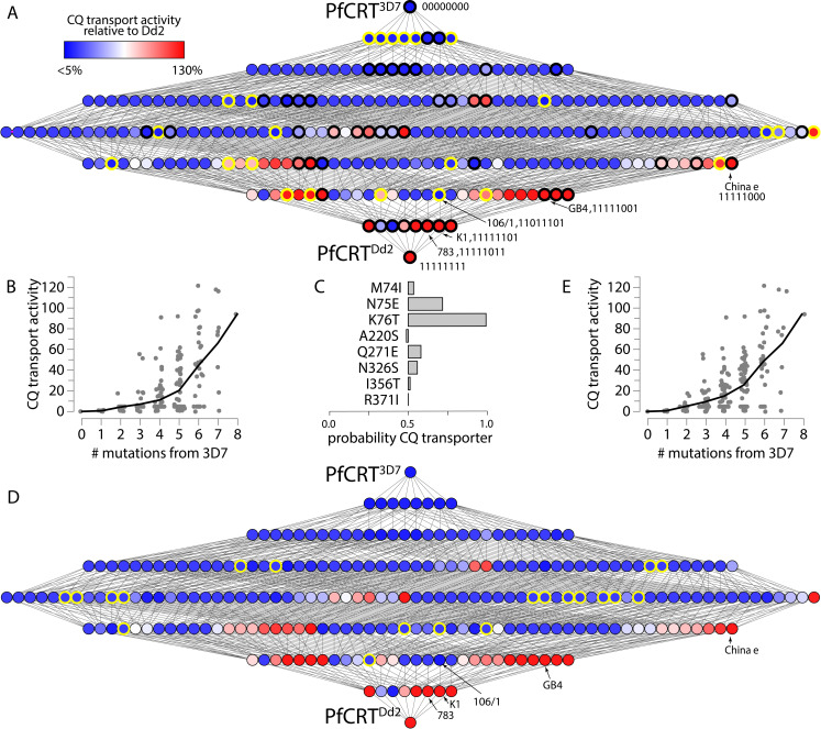Fig 6. CQ transport activities increases across the genotype-phenotype map.A) The complete genotype-phenotype map with 76 measured phenotypes and 180 predicted phenotypes. As in Fig 1A, each node represents a genotype and each edge a mutation. The nodes outlined in black are the 52 genotypes that were measured by Summers et al., 2014 [24]; the genotypes measured in this study are outlined in yellow. B) Levels of CQ transport activity moving from PfCRT3D7 (no mutations) to PfCRTDd2 (eight mutations). Each data point represents a genotype; the line is the mean across genotypes that have the indicated number of mutations. C) The contribution of each mutation to the classifier, where the x-axis is the probability that the mutation is found in genotypes that transport CQ. D) The complete genotype-phenotype map estimated using the simple K76T classifier. The nodes outlined in yellow indicate phenotypes that are predicted to have <5% CQ transport activity with this classifier, but not in the initial classifier from panel A. E) Predicted CQ transport activity as a function of the number of mutations calculated using the simple K76T classifier. |
