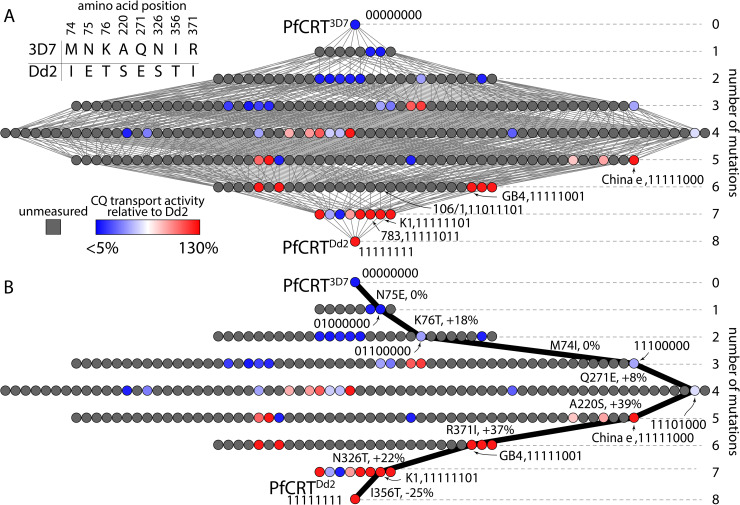 Fig 1. Only 52 of the 256 possible genotypes between PfCRT3D7 and the CQ-transporting PfCRTDd2 isoform have measured phenotypes.A) The table shows the amino acid residue differences between the wild-type (PfCRT3D7, 00000000) and mutant (PfCRTDd2, 11111111) isoforms of PfCRT. The network shows the complete set of genotypes between PfCRT3D7 and PfCRTDd2. Each node represents a different genotype with unique number and combination of the 8 amino acid residue differences between the two isoforms. Each edge connects genotypes that differ by a single mutation. Genotypes are in sorted combinatorial order, left to right, such that the second row contains 1000000, 0100000,â¦, 00000010, 00000001, the third row contains 11000000, 10100000, â¦, 00000101, 00000011, the fourth row contains 11100000, 11010000, â¦, 00001011, 00000111, etc. The gray nodes indicate PfCRT genotypes that have not had their CQ transport activities measured. The colors of the remaining nodes indicate experimentally determined CQ transport activities relative to the activity of PfCRTDd2 [24]. Values range from <5% (blue) to 130% (red). In addition to PfCRT3D7 and PfCRTDd2, the names and binary codes of five other field isoforms of PfCRTââ106/1â, âGB4â, âK1â, â783â, and âChina eââare indicated. B) One possible evolutionary trajectory from PfCRT3D7 to PfCRTDd2 that passes through only measured phenotypes. The mutations at each step are indicated next to the relevant edge, along with the effect on CQ transport activity. This trajectory passes through the PfCRTChina e and PfCRTK1 isoforms. Five of the eight steps increase CQ transport activity, two have no effect, and the final step causes a decrease. |
