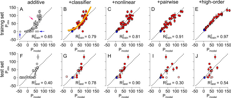 Fig 2. Models can be trained on measured phenotypes to predict uncharacterized phenotypes.The panels show the observed phenotype (Pobs) versus the predicted phenotype (Pmodel) for different input data and models. The vertical error bars represent experimental uncertainty (95% confidence interval on the mean) in the observed phenotypes. The resulting R2 value is shown within each plot and the dashed line depicts a 1:1 relationship (i.e. perfect agreement). The top row (panels A-E) shows the quality of fit for the training dataset (the 52 published phenotypes [24]) and the bottom row (panels F-J) shows the quality of fit for the test dataset (24 newly-measured phenotypes). The models are arranged from left to right in order of increasing sophistication: additive (A,F), additive+classifier (B,G), additive+classifier+nonlinear (C,H), additive+classifier+nonlinear+pairwise epistasis (D,I), and additive+classifier+nonlinear+all epistatic orders (E,J). Symbol colors denote the probability a genotype belongs to either the CQ-transporter (red) or the non-CQ-transporter (blue) class. Gray symbols (panels A, F) show the additive model, prior to the application of a classifier. The blue arrows in panel A indicate data points for which the observed phenotype is zero and the predicted phenotype is nonzero. The red arrow indicates data points for which the observed phenotype is nonzero. The yellow line in panel B shows the spline fit to the data. |