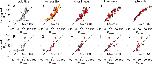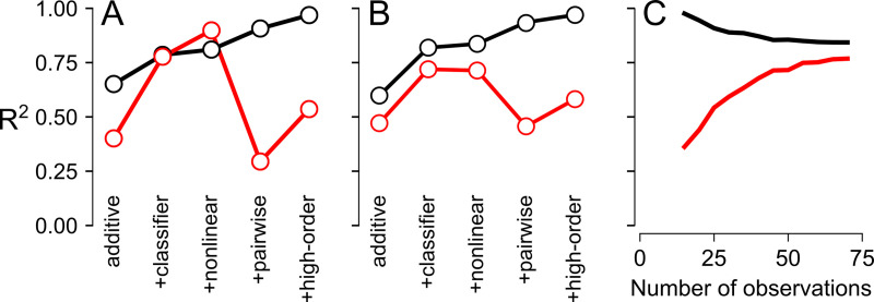 Fig 4. The additive+classifier+nonlinear model captures the most variation without over-fitting.In all panels, the lines denote R2train (black) and R2test (red). In panels A and B, the complexity of the model increases from left to right: additive model, plus classifier, plus a nonlinear spline, plus pairwise epistasis, and plus high-order epistasis. A) R2train was calculated from the 52 phenotypes used to train the model and R2test was calculated from the 24 newly-measured phenotypes. B) R2train was calculated for pseudoreplicate training sets of 52 genotypes sampled from the 76 characterized genotypes, with R2test calculated from the matched 24-genotype test datasets. C) The means of R2train and R2test converge as the number of observations in the pseudoreplicate training sets increase, reaching a plateau at ~60 genotypes (calculated with the additive+classifier+nonlinear model). |
