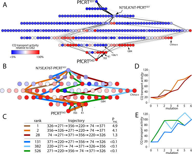 Fig 7. Selection for increased CQ transport activity strongly constrains trajectories through the map.A) Calculated trajectories through the complete genotype-phenotype map. The edges indicate the probability of a mutation over all possible trajectories from low (thin lines) to high (thick lines). The nodes indicate CQ transport activity as defined in Fig 1. B) Six example trajectories through the map between N75E,K76T-PfCRT3D7 and PfCRTDd2. C) The rank-order and mutational routes of the six trajectories shown in panel B. The Ptraj value indicates the relative probability of the trajectory. Panels D,E show CQ transport activity as a function of mutation step for the trajectories presented in panels B,C. |