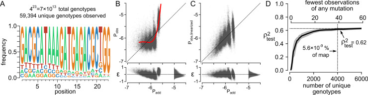 Fig 8. A predictive, additive model can be trained on a large genotype-phenotype map.A) Summary of the genotype-phenotype map [55].The map consists of 23 sites, each with four bases with the frequency at each site shown in the sequence logo. The total map has 7 × 1013 genotypes; the phenotypes of 59,394 genotypes have been measured. B) Raw Pobs vs. Padd plot for the map. Each point is a genotype. The fit residuals are shown below the main plot. We fit an 5th-order spline to linearize the map (red curve). C) The linearized form of the map, with epistasis removed using the spline shown in panel B. D) A predictive model can be trained using approximately 4,000 genotypes. The bottom x-axis shows the number of unique genotypes used to train the model (sampled randomly); the top x-axis shows the fewest number of times any mutation was seen in that sample. R2test was measured against the remaining 50,000+ genotypes not used to train the model. |