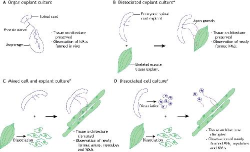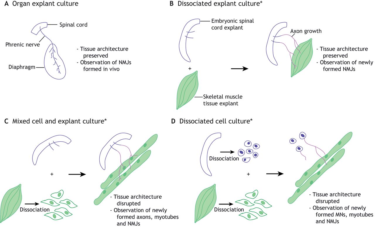 Different technical approaches to studying the NMJ in vitro. (A) Organ explant culture. (B) Dissociated explant culture. (C) Mixed cell and explant culture. (D) Dissociated cell culture. (C,D) Instead of explants or dissociated cells, immortalized cell lines or motoneurons (MNs)/muscle cells generated from induced pluripotent stem cells can be used. *Chimeric model possible (different species of origin for muscle cells and MNs).