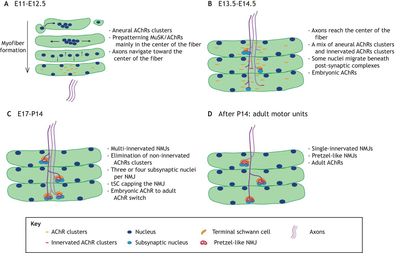 The stages of NMJ formation in mice. (A) During development, prior to and independent of innervation, AChRs are clustered in the prospective region of muscle. Thus, the muscle cell plays an instructive role from a very early stage of development, in positioning and restricting synapses to a central band in the muscle, and building a post-synaptic density prior to axonal contact. (B) Axons do not contact muscle fibers at random locations, but rather in a narrow central region of the muscle fiber characterized by the presence of aneural âpre-patternedâ AChR clusters (Lin et al., 2001; Yang et al., 2001). Axons then become apposed to AChR clusters. (C) Additionally three or four nuclei accumulate under the post-synaptic membrane in the muscle cells (which are defined as multinucleated syncytia formed during development by fusion of mononucleated precursor cells) and become specialized for transcription of synaptic proteins. Concomitantly, folds form in the muscle membrane increasing the area of contact between the post-synaptic membrane and the extracellular matrix (Guarino et al., 2019). (D) Muscle fibers are poly-innervated until the end of the second week after birth in rodents. This is when the multiple innervations of individual post-synaptic densities are reduced to a single innervating motor axon through a process called synapse elimination (Sanes and Lichtman, 2001). AChR, acetylcholine receptor; adult AChR, α2βεδ; E, embryonic day; embryonic AChR, α2βγδ; MuSK, muscle-specific kinase; P, post-natal day; tSC, terminal Schwann cell.